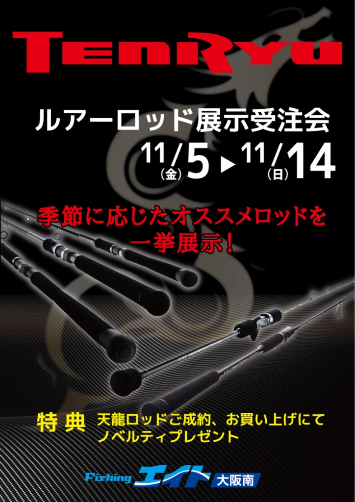 フィッシングエイト大阪南店様にて、TENRYUルアーロッド展示受注会を開催いたします。