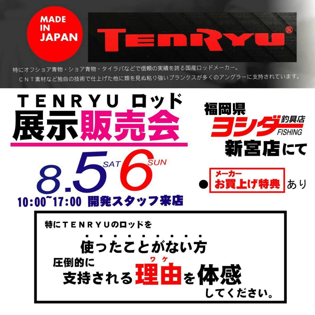 さて、今週末には福岡県のヨシダ釣具 新宮店様にて展示受注会を開催致します。