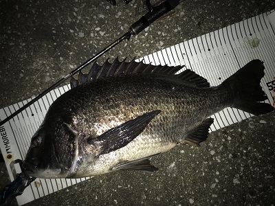 55cmのチヌです!さすがにこのサイズになると思いっきり曲がりますがこの曲がりが気持ちいいです!