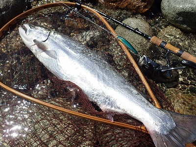 アルボル90HFの正影アユで浅瀬を早巻きしてくると大石から飛びついてきました!