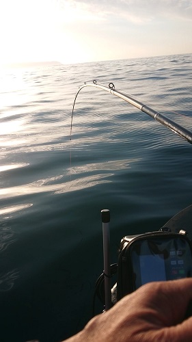 ポイントに着くと魚探には回遊魚らしき無数の反応が映っている。